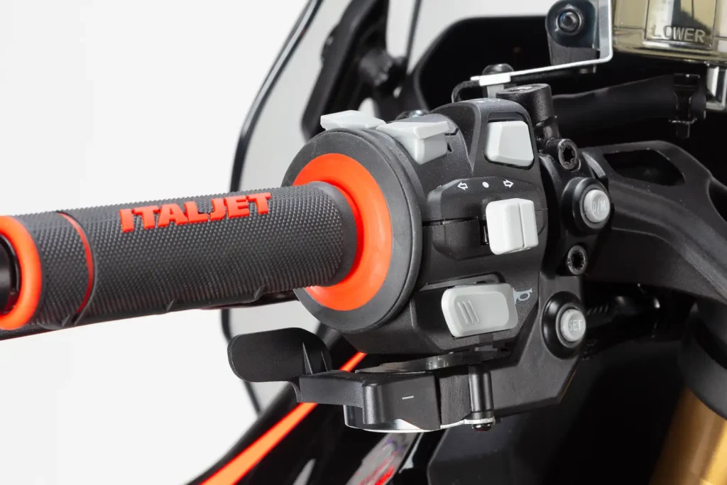 - Rear suspension: Spring-preload adjustable Marzocchi piggyback-reservoir shock w/ Italjet Stiffness Adjustment System (ISAS)