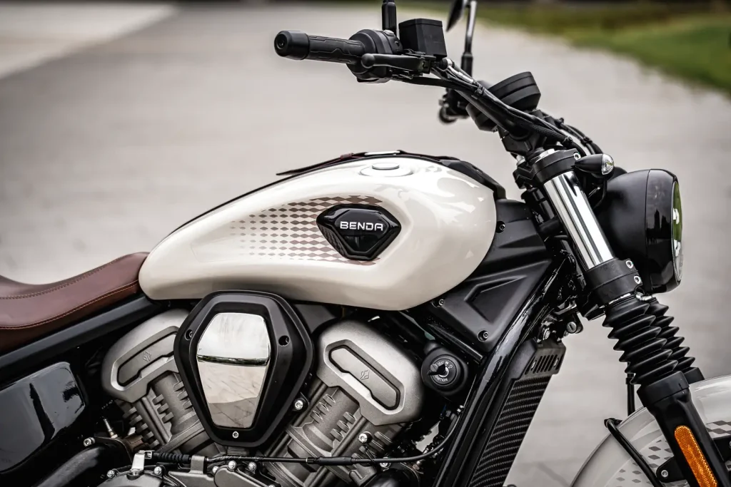 - The 2026 Benda Dark Flag 950 is powered by the Benda V4 Litre Power Platform motor. It features a DOHC valvetrain with four valves per cylinder and liquid cooling. Ever so slightly undersquare, the V4 Litre Power Platform motor develops 108 horsepower at 9000 rpm, with the 63 lb-ft torque peak arriving 2000 rpm earlier. This is about the same torque as the 999cc Indian Scout Sixty and the same horsepower as Scouts with the 1250cc SpeedPlus V-twin engine.